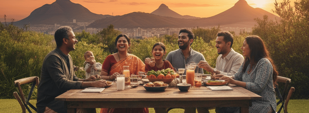 Time zone chaos, good morning gifs, and why you can't leave. For Indian expats and SA Indians navigating family group chats.